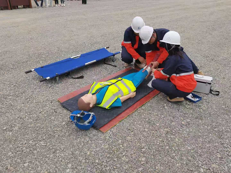 演練地點(diǎn)選擇存在高處作業(yè)風(fēng)險(xiǎn)的裝卸車(chē)棧臺(tái)管廊橋架,模擬了施工人員不慎從高處作業(yè)平臺(tái)墜落的情景。事故發(fā)生后,現(xiàn)場(chǎng)安全巡檢人員第一時(shí)間向應(yīng)急救援領(lǐng)導(dǎo)小組組長(zhǎng)報(bào)告,組長(zhǎng)立即啟動(dòng)應(yīng)急救援預(yù)案。各小組奔赴現(xiàn)場(chǎng)后,立即分析現(xiàn)場(chǎng)情況,警戒組拉設(shè)警戒線封鎖現(xiàn)場(chǎng),醫(yī)療救護(hù)組立即對(duì)傷著進(jìn)行現(xiàn)場(chǎng)急救,工程搶險(xiǎn)組對(duì)現(xiàn)場(chǎng)道路進(jìn)行疏通,各救援小組各司其職,迅速開(kāi)展應(yīng)急救援和搶險(xiǎn)。