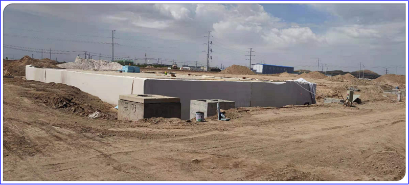 廢水處理站由初期雨水池(有效容積490m3)和事故水池(有效容積1715m3)組成。池壁、底板、頂板通過三層長絲無紡?fù)凉げ?,兩層土HDPE土工膜做防腐防滲處理。水池注水至雨水池和事故水池連接處,沉降觀測一周,池主體無滲漏后用潛水泵抽水放至現(xiàn)場。水池閉水過程嚴格按照閉水方案進行,并制定了防水現(xiàn)場應(yīng)急處置措施。