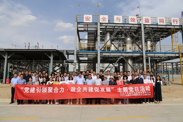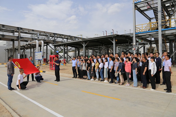 活動伊始,全體黨員俯瞰了化工園區(qū)整體建設(shè)情況,工作人員對石投集團全力打造的基礎(chǔ)配套設(shè)施管理運營、專精特新廠房集聚帶動、科技工程示范引領(lǐng)三大特色產(chǎn)業(yè)板塊進行了全面介紹。全體黨員走進石投集團專精特新產(chǎn)業(yè)園A區(qū)標(biāo)準(zhǔn)化專用廠房,看到了眾多入駐企業(yè)安裝設(shè)備、試車投產(chǎn)的火熱景象。在液態(tài)陽光示范項目現(xiàn)場,近距離參觀了解全球首套千噸級規(guī)模太陽燃料合成示范項目,并在項目現(xiàn)場,全體黨員面對鮮紅的黨旗,莊嚴(yán)地高舉右拳,鏗鏘有力地重溫入黨誓詞,將共產(chǎn)黨員的榮耀、責(zé)任和使命牢牢銘記在心中。